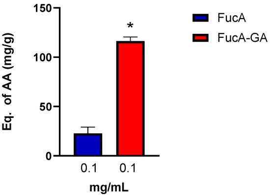 The ability of FucA and FucA-GA to donate electrons was also evaluated using the total antioxidant capacity (TAC) assay, because this test evaluated the donation of electrons in an acidic medium [34]. FucA-GA showed superior activity to FucA in the TAC assay. In addition, this FucA-GA activity was higher than those found in commercial fucoidan from U. pinnatifida [5] and fucoidan from Fucus vesiculosus [63]. These results indicate that FucA-GA can be a good electron donor under different pH conditions (Figure 5). In this test, GA (0.037 and 0.074 mg/mL) did not show antioxidant activity.