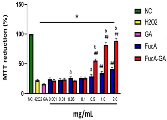 Figure 7. Effect of different amounts (mg/mL) of FucA and FucA-GA on the ability of MC3T3 cells to reduce MTT in the presence of H2O2. NC—negative control composed only of culture medium with fetal bovine serum. H2O2—positive control composed of culture medium with fetal bovine serum and H2O2 (500 µM, final concentration). GA—gallic acid (0.074 mg/mL). * p < 0.0001 vs. NC. # p < 0.001 vs. H2O2. ## p < 0.0001 vs. H2O2. (a) indicates a significant difference between FucA and FucA-GA samples (p < 0.05) at the same concentration. (b) indicates a significant difference between FucA and FucA-GA samples (p < 0.0001) at the same concentration.