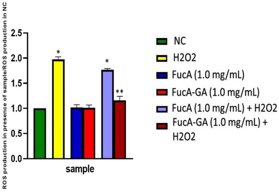 Fucoidans from Undaria pinnatifida, Sargassum muticum, and Turbinaria ornata can promote osteogenesis by reducing the presence of intracellular ROS, thus reducing the deleterious effects of these reactive species on osteoblasts [67]. Therefore, we investigated whether FucA and FucA-GA could protect pre-osteoblastic cells from oxidative damage.