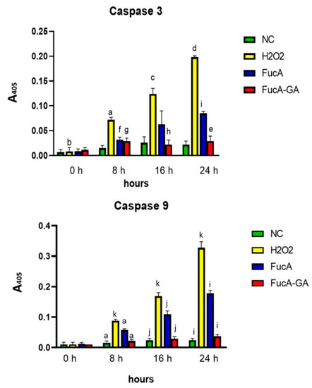 Figure 9. Effect of FucA (1.0 mg/mL) and FucA-GA (1.0 mg/mL) on caspase-3 and caspase-9 activity in MC3T3 cells exposed to H2O2-induced oxidative stress. H2O2 was used at 500 µM (final concentration). NC—negative control composed only of culture medium with fetal bovine serum. (a) p < 0.0001 vs. NC 8 h. (b) p < 0.05 between the samples of H2O2 0 h and H2O2 8 h; 16 h and 24 h. (c) p < 0.01 vs. NC 16 h. (d) p < 0.01 vs. NC 24 h. (e) p < 0.05 vs. H2O2 24 h. (f) p < 0.0001 vs. H2O2 8 h. (g) p < 0.01 vs. H2O2 8 h. (h) p < 0.01 vs. H2O2 16 h. (i) p < 0.001 vs. H2O2 24 h. (j) p < 0.001 vs. H2O2 16 h. (k) p < 0.001 vs. H2O2 0 h. The caspase activity was monitored at the times indicated by measuring the absorbance at 405 nm (A405).