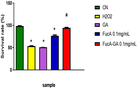 Gallic acid can be conjugated to polysaccharides using several methods [40]. Of these, the redox method is advantageous as it does not generate toxic reaction products and can be carried out at room temperature to avoid the degradation of antioxidants [41]. Therefore, in the present study, FucA obtained from the seaweed S. schröederi was modified with GA using the redox method, and its antioxidant activity was evaluated in the oxidative process. In addition, FucA and its GA-conjugate derivate were evaluated regarding whether they could protect pre-osteoblastic (MC3T3) cells from oxidative damage.