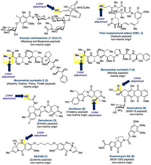 Selected payloads used in antibody-drug conjugates from marine and non-marine origin.