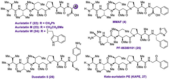 Although it is out of the scope of the present review, it is important to mention alternative tactics that are being explored with the auristatins with the objective of targeting cancer cells in a highly selective manner by means of platforms different from antibodies recognized by tumor antigens. Among these alternative devices, it is worth highlighting low-molecular-weight ligands for antigens such as the prostate-specific membrane antigen (PSMA) [129] or integrin ανβ3 [130], aptamers [131], gold nanoclusters [132] or radiolabeled proteins [133].