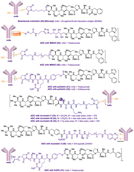 Related to monomethyl auristatin E (3), other auristatin analogs have been selected and used as alternative payloads for other ADCs such as auristatins F (22), M (23), and W (24), the monomethyl analog of auristatin F (MMAF, 4), PF-06380101 (25), duostatin 5 (26) or the keto auristatin PE (KAPE, 27) (Figure 6). In the case of monomethyl auristatin F (MMAF, 4), it highlights the belantamab mafodotin ADC (28), which was approved by the FDA in 2020 as Blenrep for the treatment of adult patients with relapsed or refractory myeloma [17]. Another mafodotin-based ADC is depatuxizumab mafodotin, whose antibody (mAb 806) targets a unique tumor-specific epitope of EGFR and is currently being employed in several clinical trials in patients with glioblastoma or with EGFR-overexpressed solid tumors [90]. On the other hand, an antibody extensively employed in directed therapies is trastuzumab (HER2), which was extended to an ADC based on dolastatin 10 or related analogs as payloads. One example is the report by Satomaa et al., who prepared ADC 29, which consisted of the payload MMAD (12) linked to the antibody through an imine group formed between an aldehyde group of the glycan portion of the glycoprotein and an amino group of the linker-drug (ADC 29) [91]. A related ADC, based on MMAD as a payload and trastuzumab as mAb, was achieved by Yang et al. by means of a maleimide-based linker containing a polyethylene glycol [92]. The resulting ADC 30 was evaluated in a murine HER2+ ovarian SKOV3 xenograft tumor model displaying lower tumor efficacy compared with other related ADCs carrying MMAE (Figure 7).