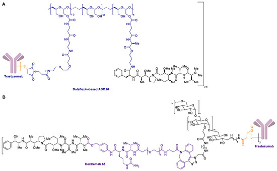 As with this case, we can find in the literature many other examples in which auristatins are employed as payloads of choice as a benchmark for the development of new strategies and tactics in the field of ADC with the possibility to be expanded to other payloads. Remarkable examples are the development of novel platforms that allow high drug loading and a controlled bystander effect. Such is the case of dolaflexin, also known as fleximer, a novel auristatin ADC platform consisting of a polymer of poly-1-hydroxymethylethylene hydroxymethylformal, which provides high hydrophilicity and polyvalence with DARs of 10–15 [122]. The resulting ADC 64, with trastuzumab as an antibody, displayed an enhanced activity relative to conventional ADCs and increased tolerability with minimum toxicity (Figure 9A). Clinical studies of the dolaflexin-based ADC in the context of XMT-1536, which targets NaPi2b, were considered according to the promising results obtained with the ADC XMT-1536 against MSCLC adenocarcinoma and epithelial ovarian cancer in animals [123]. In the same strategic direction, dextran polysaccharide was also employed as a DAR- and polarity-enhancing scaffold. In this case, the functionalized dextran derivative was coupled with an engineer-modified trastuzumab, possessing a microbial transglutaminase (mTG) recognition tag LLQG at the C-termini of its heavy chains, and then assembled with a DBCO derivative of MMAE through a strain-promoted azide-alkyne cycloaddition (SPAAC) with the azide groups previously introduced in the polysaccharide. The resulting ADC 65, named dextramabs, presented a DAR of 8 without compromising stability and solubility properties [124]. In addition, the ADC targeted and killed HER2-positive SK-BR-3 cells at subnanomolar concentrations (Figure 9B). Similarly novel and interesting is the poly-ADP-ribose polymer employed in the design of new ADCs for the enhancement of their physicochemical and pharmacological properties, in which a DBCO-MMAF derivative was employed [125].