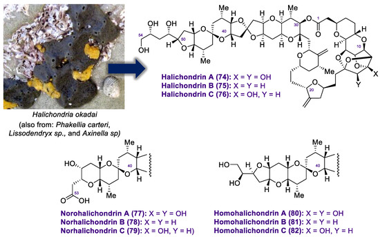 The halichondrins are a family of natural products characterized by a highly complex polyether macrolide containing an unprecedented 2,6,9-trioxatricyclo[3.3.2.0]decane ring system. Halichondrins were originally isolated from the Japanese marine sponge Halichondria okadai [134], and further congeners were subsequently discovered in unrelated sponges such as Phakellia carteri [135], Lissodendryx sp. [136,137,138], and Axinella sp. [139]. Except for halichondrin A [140], all the subgroup members have been isolated from natural sources. The structure diversity that distinguishes the various members involves two sites: the oxidation state at C10, C12, and C13 of the C8–C14 polycycle and the length of the carbon backbone. According to this, the halichondrins are classified into the A–C (74–76) series or the norhalichondrin (77–79) and homohalichondrin (80–82) series (Figure 10).