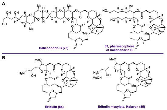 (A) Molecular structures of halichondrin B (75) and pharmacophore 83; (B) Molecular structures of eribulin (84) and eribulin Mesylate (85).