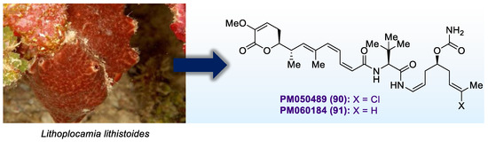 PM050489 (90) and its dechlorinated analog, PM060184 (91), are two marine natural products isolated from the Madagascan sponge Lithoplocamia lithistoides by PharmaMar (Figure 12) [155].