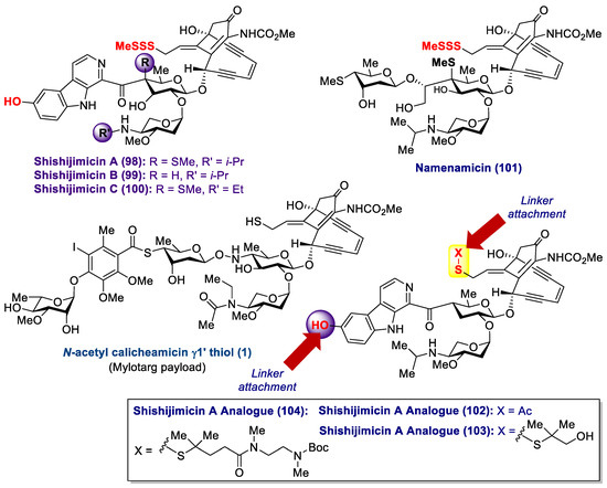 - Nicolaou, K.C.; Li, R.; Chen, Q.; Lu, Z.; Pitsinos, E.N.; Schammel, A.; Lin, B.; Gu, C.; Sarvaiya, H.; Tchelepi, R.; et al. Synthesis and biological evaluation of shishijimicin A-type linker-drugs and antibody-drug conjugates. J. Am. Chem. Soc. 2020, 142, 12890–12899. [Google Scholar] [CrossRef] [PubMed]