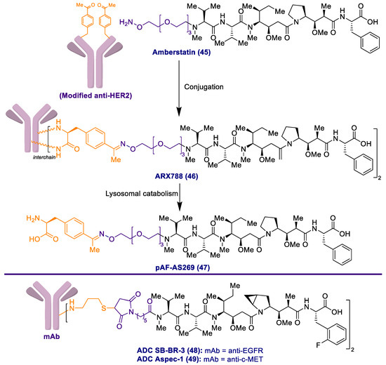 Another interesting MMAF analog is amberstatin 45, which consists of an N-terminal PEGylated MMAF derivative with a terminal oxyamine group, which was employed as a connection point with the antibody [102]. To this aim, two residues of p-acetylphenylalanine were incorporated into an anti-HER2 antibody and connected to the payload through a highly stable oxime, presenting a DAR of 1.9. This ADC 46 also corresponds to the noncleavable class, so upon cellular internalization in HER2+ cancer cells, the metabolite pAF-AS269 47 was produced. This ADC displayed potent antitumor activities against breast, lung, gastric and ovarian cell lines with IC50 values in a 0.025–0.316 nM range. This strong activity was observed when this ADC was dosed in xenograft mouse tumor models possessing either high or low HER2+ expressing tumors. Together with these promising results, its high stability in serum and long half-life of 12.5 days triggered its entry into several phase I clinical trials, which are currently ongoing [103]. Another MMAF analog considered for ADC development was a cyclopropyl fluoro derivative, which was incorporated into the ADCs 48 and 49 in an attempt to address some pharmacological issues such as toxicity, expecting that the payload would not be subject to cellular efflux and thus exert less toxicity. Thus, the ADCs, consisting of the anti-EGFR and of the anti-c-MET antibodies conjugates, were prepared, revealing a DAR of 2 [104]. While the first was not well tolerated in preclinical studies at 10 mg/kg doses, the second displayed a better pharmacological profile, combined with strong cytotoxic activity against c-MET-expressing cell lines, including NCI-H1993, MKN-45, and HCCLM3 with IC50 values of 16.3, 7.8 and 3.2 ng/mL, respectively [105]. Surprisingly, in contrast to the strong antitumor activities of this ADC, the corresponding payload displayed weak activity against the cell lines with IC50 values in the range of 1700 nM. Additionally, this ADC exhibited strongly in vivo efficacy in a murine xenograft model in a c-MET-expressing pancreatic cell line (Aspc-1) at 10 mg/kg and is currently being evaluated in two phase I clinical trials in patients with advanced solid tumors (Scheme 4).