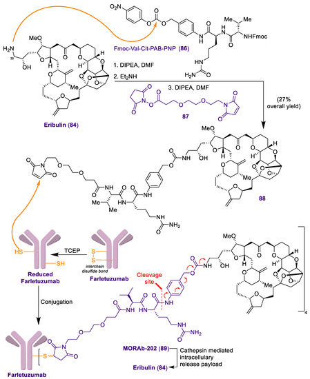 The connection of eribulin (84) and the linker was based on the nucleophilic attack of the primary amine at carbon-35 in eribulin to the carbonate group contained in Fmoc-Val-Cit-PAB-PNP (86). Subsequent Fmoc deprotection, using diethylamine, afforded the corresponding free amine, which was reacted with 87 to obtain the maleimide linker attached to eribulin 88. Then, the antibodies were prepared for conjugation by rupturing their interchain disulfide moieties into thiols via reaction with tris(2-carboxyethyl)phosphine (TCEP). The resulting reduced antibody was conjugated with the linker-eribulin 88 through its maleimide moiety to furnish the desired ADC, MORAb-202 (89), at a drug-antibody ratio of 4.0 (Scheme 9). Ultimately, eribulin payload is released intracellularly by the action of cathepsin, a lysosomal protease highly expressed in cancer cells versus normal cells (Scheme 9).