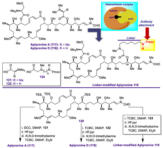 - Anzicek, N.; Williams, S.; Housden, M.P.; Paterson, I. Toward aplyronine payloads for antibody-drug conjugates: Total synthesis of aplyronines A and D. Org. Biomol. Chem. 2018, 16, 1343–1350. [Google Scholar] [CrossRef] [PubMed]