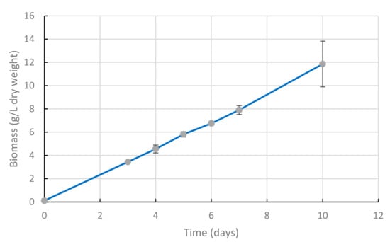 However, as the number of samples collected over time was too scarce, data only allowed suggesting that a similar linear growth would occur in this pilot experiment after 15–20 h. Productivity and yields are discussed below (Cf. Section 2.9).