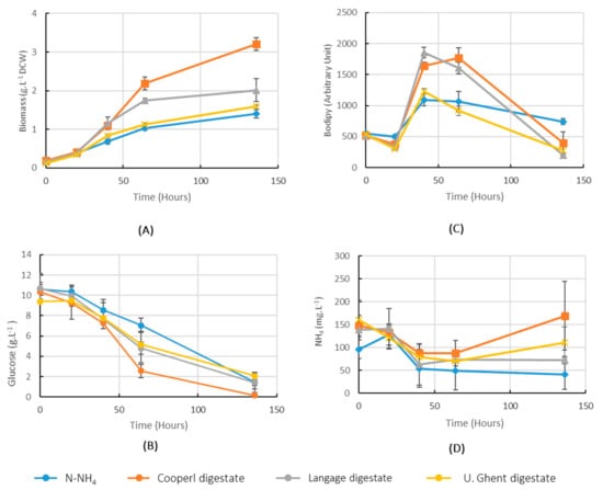 Cultures in bubbling and shaking 800 mL supplemented with digestates from three different sources and with 0.297 g.L−1 NH4Cl (final concentration) as control source of nitrogen (see Section 4.1.2 for detailed description of culture medium). Mean values (n = 3, error bars = S.D.). (A): biomass production kinetics; (B): glucose concentration in cultures; (C): relative lipid content in cells as measured by BODIPY-stained cell fluorescence; (D): NH4 concentrations in cultures.