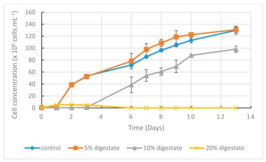 The influence of digestate supply quantity was investigated in flask cultures (Figure 3). The addition of 5% digestate allowed, as compared to YEP modified control condition, a slightly higher cell concentration between 7 and 10 days, and the same final cell concentration after 13 days.