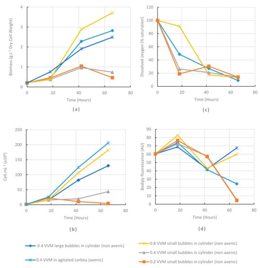 Results (Figure 4a) showed that the highest biomass concentration value (3.7 g.L−1) in non-axenic cylinder was obtained after 66 h of culture, with small bubbles at the maximum tested flow rate (0.8 VVM). Both cylinders with small bubbles at lower flow rates (0.4 and 0.2 VVM) allowed only poor cell and biomass production (Figure 4a,b). As the dissolved oxygen values were also the lowest in these two cylinders (Figure 4c), oxygen transfer limitation likely explained this lower growth performance. At 0.4 VVM, large bubbles, as compared to small bubbles, allowed higher dissolved oxygen values, with higher cell growth and biomass values. We hypothesized that the airlift effect was less efficient when small bubbles were used, then reducing oxygen transfer and mixing.