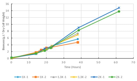 Effect of medium supplementation on biomass production in 500 L reactor cultures (2 replicates). 1X-1, 1X-2: simple batch (no feeding); 1.3X-1, 1.3X-2: feeding with 30% of initial medium organic concentrate after 16 h; 2X-1, 2X-2: feeding with 100% of initial medium organic concentrate after 16 h.