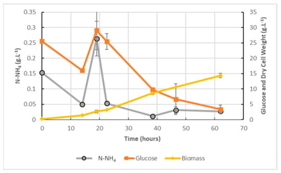 The most productive pilot-scale culture (fed-batch 2X, 5% digestate, 40 g.L−1 glucose) was assessed for glucose conversion and for N-NH4 depuration efficiency. Figure 7 shows that from 20 g.L−1 of glucose added at 0 h followed by a second addition of 20 g.L−1 at 20 h, only 3.3 g.L−1 remained at the end of culture, and that it was reduced progressively as biomass concentration increased. From the 0.30 g.L−1 N-NH4 added in medium, only 0.025 g.L−1 remained at the end of the culture (more than 90% depuration ratio). Ammonia stripping due to aeration could occur in cultures when pH values are above 7 [27]. However, as pH was maintained below pH 6.5 after 14 h (data not shown), the rapid drop in N-NH4 observed after feeding (16 h) could be assigned to cell trapping of N-NH4, illustrating the high efficiency of A. mangrovei in depuration of N-NH4 and the use of NH4 from digestate as part of the nitrogen source in medium.