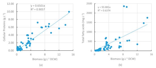 Cellular protein (a) and total fatty acid (b) concentrations versus biomass concentration, from a data set of 14 kinetics in 450 and 500 L cultures and 3 kinetics in 260 L cultures, over a 6 month period.