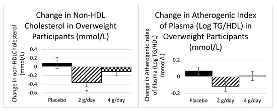 The mean change in non-HDL cholesterol and the atherogenic index of plasma after six weeks of treatment for each of the placebo and active treatments in the overweight participants. n = 30 (Placebo = 11, 2 g = 10, and 4 g = 9). Standard error bars shown. * Significant at p < 0.05.