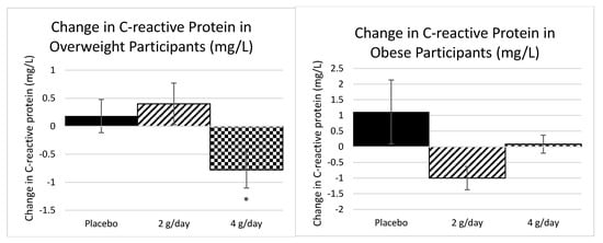 There was a significant reduction in CRP (−27%) in the 4 g dose in the overweight participants (p = 0.03) and a trend towards a reduction in CRP (−27%) in the 2 g dose in the obese participants (p = 0.06), as determined by a Kruskal–Wallis test (Figure 2). The obese group started at a considerably higher inflammation status than the overweight group.