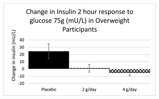 There were no consistent changes in fasting glucose, fasting insulin, C-peptide, HOMA, or two-hour glucose response to the OGTT across the three treatment groups for either the overweight (p = 0.17, 0.34, 0.49, 0.15, and 0.86, respectively) or the obese groups (p = 0.86, 0.14, 0.14, 0.22, and 0.28, respectively) (ANOVA for fasting glucose and two-hour glucose; Kruskal–Wallis for remaining variables). However, there was a trend towards a reduction to the two-hour insulin response to the OGTT (−12%) in the 4 g dose for the overweight participants only (p = 0.05), as determined by a Kruskal–Wallis test (Figure 3).