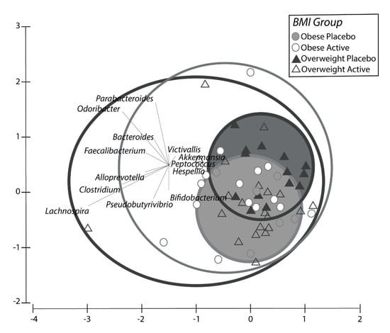There were significant differences (p < 0.05) between the pooled active treatments groups (2 g SXRG84/day and 4 g SXRG84/day combined) compared to the placebo group for both overweight and obese participants as separate groups in terms of the most-changed composition and abundance of genera of bacteria from before and after the six-week intervention. This pattern was consistent for both the overweight and the obese participant groups (Figure S3). Below, Figure 4 depicts the change in composition and abundance of genera over a six-week period between the overweight and obese participants on placebo (enclosed circles), which was much smaller compared to those on the active treatment (open circles).