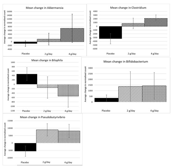 Permutational multivariate analysis is a powerful tool to demonstrate the overall ecological shifts of significance in the treatment and control communities of the microbiome, or the effective changes to the betadiversity. However, translating ecosystem shifts in local diversity compared to the global diversity, or betadiversity, to select species is only complicated by cascading interaction and external effects. Nevertheless, it is of interest to determine which species contributed to the significant change in betadiversity, as experiments can be designed to test cause-and-effect studies over time. Therefore, SIMPER analysis revealed 15 genera that contributed to at least 90% of the differences between placebo and pooled active group changes (Table 4). These 15 genera were examined individually to assess whether there were consistent changes in the two treatment groups compared to the placebo group. Five genera were identified that appeared to demonstrate a treatment effect. The individual genera that increased most in contrast to the placebo group were Akkermansia, Clostridium, Pseudobutyrivibrio, and Bifidobacteria (mostly B. longum) sp. Although not identified in the SIMPER analysis, only one genus seemed to decrease, and this was Bilophila sp. (Figure 5)—although the frequency of this change was not large enough to be considered one that contributed to 90% of the variation across treatments.