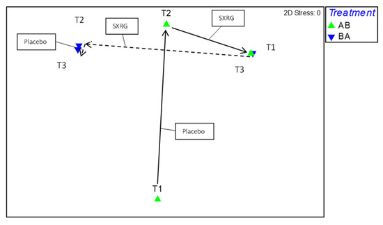 A permutational multivariate analysis of variance was used to determine if there were any significant differences in gut microbiota between the two treatment regimens across the three time points, resulting in comparisons between six groups. There were no significant differences between the six groups (p > 0.05). A correlation plot was then used to assess the movement of gut microbiota per regime group and time point (Figure 6), on which each data point represented a time point per regime group. After visual inspection of the correlation plot, it was apparent that the two regime groups at baseline varied greatly, with movement occurring at each time point. A SIMPER analysis was conducted to determine whether there were any consistent increases or decreases in genera common to both the active treatments and not the placebo treatment. There were three genera identified that consistently changed in both regimes after the SXRG84 treatment with no effect or an opposing effect in the placebo groups—these were an increase in both Fusicatenibacter and Parabacteroides and a decrease in Clostridium.