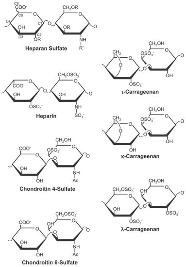 The three main forms of carrageenan (iota, kappa, and lambda) show structural similarities with the major sulphated polysaccharide types (Figure reused from Buck et al. citation [9] under Creative Commons Attribution Licence).