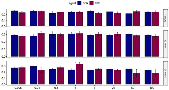Across the eight tested concentrations, there was no statistically significant difference in human normal salivary gland-SV40 transformed-acinar cell (NS-SV-AC) viability when exposed to either carrageenan or saline control at 4, 12, and 24 h, except for 1 µg/mL carrageenan at 24 h, showing lower viability than control (p = 0.029) (Figure 2). At 100 µg/mL, the highest tested concentration, the time to the toxicity of carrageenan was comparable to the negative saline controls over 24 h (Figure 3).