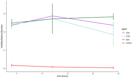 Time to the toxicity of 100µg/mL carrageenan (CGN) on salivary gland cells over 24 h compared to saline (CTRL), 1% SDS (SDS), and untreated cells (UNTRTD) controls.