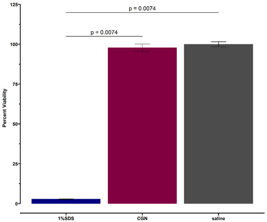 Twenty-four-hour viability of tissues exposed to carrageenan (CGN) with saline (negative) and 1% SDS (positive) controls. Each bar represents the mean value from duplicate samples.