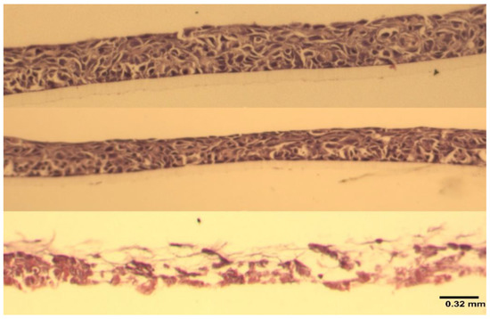 A composite figure of the corresponding histological sections from Figure 4. Top to bottom—carrageenan-treated (100 µg/mL), untreated control, positive control (1% SDS). 20× hematoxylin and eosin staining. Image scale: 0.32 mm.
