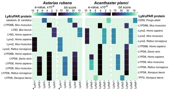 E-value and bit score heatmaps for putative TFPs from A. rubens and A. planci predicted by BLAST search vs. closest Ly6/uPAR proteins. Darker cells correspond to higher bit-scores and lower e-values of blast hit. The sequence of LyAr1 from A. rubens studied in this work (Lystar5) is designated by asterisk. Correspondence of putative TFPs from starfishes to the transcript IDs in the NCBI database is given in Table S2.
