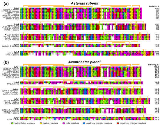 Analysis of the amino acid sequences of the BLAST hits revealed that the highest homology (close to 50% or higher) was observed between A. rubens LyAr4/LyAr6 and mammalian LYPD6/LYPD6B proteins; A. rubens LyAr1 and mammalian Lynx2; A. planci LyAp4 and mammalian LYPD6/LYPD6B; A. planci LyAp3 and frog TFP2; A. planci LyAp1/LyAp5 and mammalian LYPD1; and A. planci LyAp2 and mammalian LYPD6 (Figure 2). Other found putative TFPs (A. rubens LyAr3 and LyAr5, and A. planci LyAp6) demonstrated homology with known TFPs less than 50%. This, given that the content of conserved Cys residues is ~15–16% of the LU-domain amino acid sequence, makes the homology with snake toxin candoxin, mammalian LY6D, and orangutan CD59 rather speculative. Nevertheless, these starfish proteins, if expressed, will also have the three-finger structure.