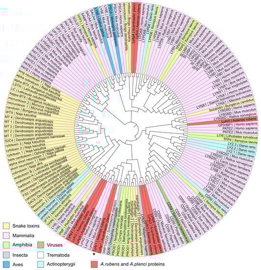 To search TFPs in starfish, we compiled a list of 153 known TFPs from various organisms containing a single LU-domain. This list included TFPs from mammals, amphibians, insects, birds, fishes, flatworms, and viruses, as well as snake three-finger toxins (Table S1). The genome of non-toxic starfish A. rubens [,,] was analyzed. In addition, to find possible three-finger toxins, we analyzed the genome of toxic starfish A. planci [,,], which feeds on polyps of reef-building corals and affects the population of endangered coral reefs [,]. BLAST search with restrictions on e-value (<10−5) resulted in five and six possible TFPs in A. rubens and A. planci, respectively. For easy reading, we named these sequences as LyAr1-5 for A. rubens and LyAp1-6 A. planci (Table S2). These putative proteins demonstrated a sequence homology with frog TFP2, snake toxin candoxin, and the proteins CD59, LY6D, Lynx2, LYPD6, and LYPD6B having human, rat, mice, bovine, fish, and frog origin (Figure 1).