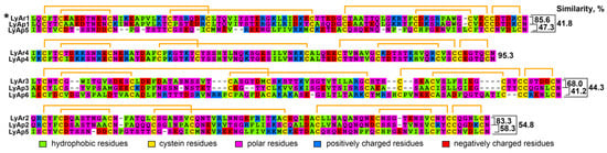 From the found proteins, LU domains were isolated and combined with a list of reference LU-domains. The resulting sequences were subjected to multiple sequence alignment (MSA) using ClustalW ver. 2.1 (EMBL-EBI, Hinxton, UK) []. In this case, a modified substitution matrix was used: similar to BLOSUM62, in which a high (99) and a low (−4) coefficients were assigned for cysteine-cysteine substitutions and for cysteine substitutions for other amino acid residues, respectively. The guide tree obtained from MSA was used to visualize the homology between the sequences. The iTOL ver 6.0 service (Biobyte Solutions, Heidelberg, Germany) [] was used to build a tree. To calculate pairwise similarity between sequences, the residues were divided into groups: hydrophobic (A,F,H,I,L,M,P,V,W), cysteines (C), polar (G,N,Q,S,T,Y), positively (K,R) and negatively (D,E) charged. Similarity was calculated as the percentage of coincidences of residues belonging to the same group in each position when comparing aligned sequences.