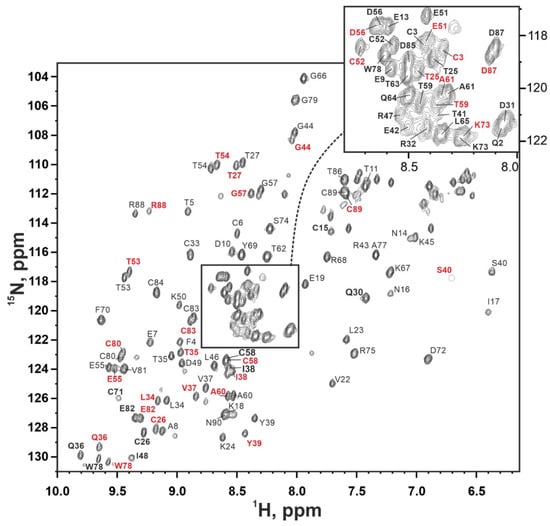 The almost complete assignment of backbone resonances (HN, N, Hα, C, Cα) was obtained (Figure 5, Table S6). Five of the 88 expected signals of amide groups were not observed in the spectra, most likely due to the signal broadening induced by fast solvent exchange in the vicinity of charged groups.