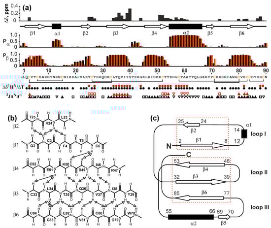 The determined chemical shift values were used to calculate the secondary structure using the TALOS-N program []. The obtained data were also supported by the values of HNHα scalar couplings as well as temperature gradients of amide protons (Figure 6a). Six β-strands were identified: Gln2-Ala8 (β1), Lys24-Thr25 (β2), Arg32-Tyr39 (β3), Leu46-Thr53 (β4), Tyr69-Phe70 (β5), and Ala77-Asp85 (β6). In addition, two helical segments were observed: short turn Asn12-Asn14 (α1) and distinct long α-helix Glu55-Gly66 (α2). The relative positions of the β-strands were determined from the contacts in the 3D 15N-NOESY-HSQC spectrum (mix 0.2s) and from the structural homology with other TFPs (Figure 6b). It was shown that the structure contains two antiparallel β-sheets: the first one contains the β1 and β2 strands, the second one includes β3, β4, and β6 strands. The strands β1 and β2 form the loop I, which also contains a short helical turn α1. The strands β3, β4, and β6 form the second β-sheet, which stabilizes the loops II and III. The loop III contains the α2 helix and additional short segment β5 (Figure 6c). Notably, the Gln2-Ala8 (β1) and Lys24-Thr25 (β2) segments that form the loop I have significantly different lengths, although demonstrate a high stability of the β-structure (Figure 6a). This can be explained by stabilization of the β1 segment not only by the contacts with the β2 segment, but also with the β4 strand from the adjacent β-sheet. This β1-β4 contact was confirmed by the cross-peaks in the NOESY spectrum (Figure 6b). Similarly, the short β5-segment (Tyr69-Phe70) in the loop III most likely interacts with the “outer” side of the second β-sheet in the region of the β6-strand.