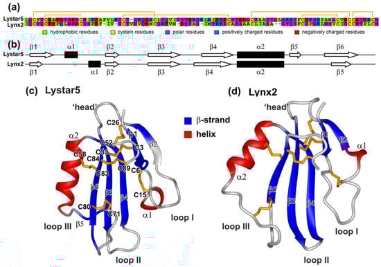 Comparison of structural features of Lystar5 and Lynx2. (a) Alignment of primary structures of Lystar5 and Lynx2. Disulfide bonds are shown by orange brackets. (b) Comparison of secondary structures of Lystar5 and Lynx2. (c) Ribbon representation of the Lystar5 spatial structure predicted by AlphaFold2 []. (d) Ribbon representation of the Lynx2 spatial structure obtained by NMR (PDB Id 6ZSS). Experimentally defined elements of the secondary structure are denoted by color: β-strands in blue and helical elements in red. Disulfide bonds are in gold.