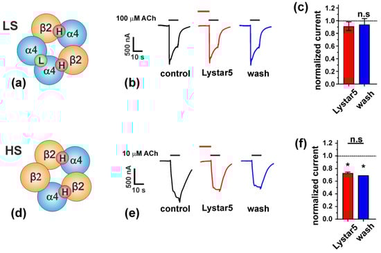 Lystar5 interaction with α4β2-nAChRs. (a,d) Composition of high selective (HS) and low selective (LS) subtypes of α4β2-nAChR. (b,e) Representative current traces through LS (b) and HS (e) α4β2-nAChRs expressed in X. laevis oocytes, evoked by 10 µM (HS receptors) or 100 µM (LS receptors) acetylcholine (ACh). The bars above the traces designate the application of specific compounds, the Lystar5 bar is off-scale along time axis (50 µM Lystar5 preincubation time 15s). (c,f) Average current amplitudes normalized to the control currents (before Lystar5 application) at LS (c) and HS (f) receptors, mean ± SEM, n = 4. * (p < 0.05) indicates significant differences between the group and control value (1.0) by one-sample two-sided t-test, n.s.—non-significant difference.