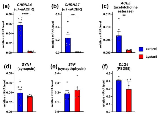 Analysis of the Lystar5 influence on expression of α4 (a), α7 (b) nAChR subunits, acetylcholine esterase (c), synapsin (d), synaptophysin (e), and PSD95 (f) in rat hippocampal neurons upon 7-day incubation. The mRNA level was normalized to the β-actin level and presented as a relative level ± SEM (n = 4–6). ** (p < 0.01) and **** (p < 0.0001) indicate significant difference between the data groups according to two-sided t-test.