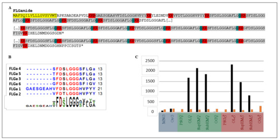 The in silico analyses of the new transcriptome assembly identified two similar complete protein precursors (Figure 2), probably derived from alternative splicing. The first precursor, named FLGa A, encoded six neuropeptides; this precursor carried seven copies of the neuropeptide FLGa 3 and a single copy of the other neuropeptides. The second precursor, FLGa B, differed from FLGa A only by an additional copy of the neuropeptide FLGa 3.