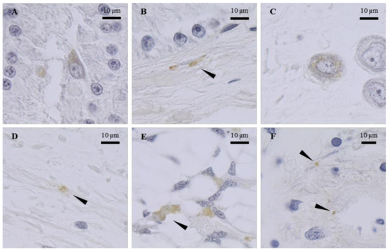 In the oviduct gland, the cells immunostained with the anti-FLGa antibody were detected in the secretory areas (Figure 3A). The nerve fibers labeled with the same antibody were also observed in the connective tissue that surrounds the gland. Similar observations were made with the anti-PYY antibody (Figure 3B). The oviduct contained endings labeled with the two antibodies, as well as cells with their cytoplasm labeled with the anti-FLGa antibody (Figure 3C,D). In the main nidamental gland, the bundles of labeled nerve fibers were abundantly detected in the distal portion of the gland, with both antibodies diluted at 1/500. In the ovarian stroma, the nerve endings labeled with anti-FLGa and anti-PYY antibodies (Figure 3E,F), diluted at 1/500, were detected. In the CNS, the anti-PYY and anti-FLGa antibodies were used at a 1/1000 dilution. The fibers and neurons labeled with both antibodies were observed in the paleovisceral lobe (Figure 4A,B).