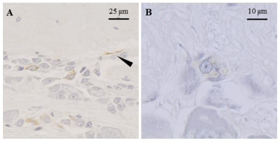 Immunocytochemical detection of neuropeptides of the FLGamide family in the SubEM of the paleovisceral lobe in female cuttlefish. (A): A group of neurons and a nerve fiber immunostained with the PYY antibodies; (B): A neuron with immunostained cytoplasm with FLGa antibodies. Arrowhead indicates immunostained nerve fiber.