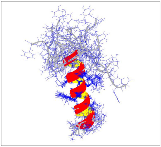 Superimposition of the 18 lowest energy conformers of the peptide FLGa 1 in DPC micelles, fitted on segment 4–14 backbone atoms (rmsd: 0.260).