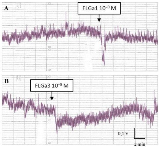 From the structural point of view, there is no defined structure of the peptide FLGa 1 in water, as generally encountered with a small peptide. However, in a micellar medium, an extended alpha helix is found after molecular modeling using NMR constraints. Such a peptide folding is consistent with a direct binding to the membrane receptor or membrane interaction, with the idea that the peptides are thought first to interact with the membrane and then migrate and bind specifically to their receptors [34,35].