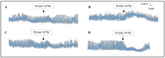 The tests carried out on the mature main nidamental glands showed the heterogeneous biological activity of the two neuropeptides: at 10−8 M, FLGa 1 increased the amplitude of the contractions of the gland (Figure 7A). At 10−6 M, it also induced an increase in the tonus (Figure 7B). At 10−8 M, the neuropeptide FLGa 3 triggered a slight temporary increase in the tonus, followed by a slight temporary decrease in the amplitude of the contractions (Figure 7C). At 10−6 M, this same neuropeptide induced a marked decrease in the amplitude of the contractions (Figure 7D). After ca. fifteen minutes, the amplitude of the contractions returned to the basal level. In order to check the existence of a synergy between the FLGamide and the other neuropeptides, we conducted an experiment on the main nidamental gland (Figure 8). Firstly, 10−6 M FMRFamide was dripped into the vessel (Figure 8A). Then, the two neuropeptides were dripped simultaneously at 10−6 M (Figure 8B). The neuropeptide mixture triggered a sharp increase in the amplitude of the gland contractions. A similar, but more intense and lasting effect, was observed on this same gland with a simultaneous dripping of FMRFamide and FLGa 1 at 10−6 M (Figure 8C).