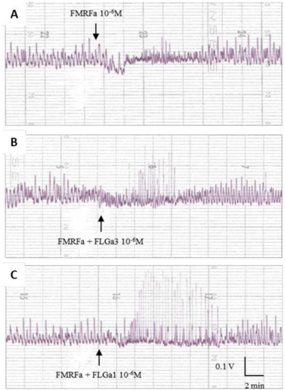 Synergistic activity of FLGamide with FMRFa, biological activity on MNG of mature cuttlefish. (A): FMRFa alone; (B): potentiation of FMRFa by FLGa3; (C): potentiation of FMRFa by FLGa1. Neuropeptides of the FLGamide family acted in synergy with FMRFamide on MNG, triggering a temporary myoexcitatory effect.